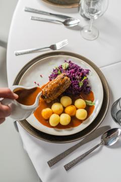 Oferujemy szeroką gamę dań, które mogą być dostosowane do indywidualnych preferencji Gości. Nasze menu obejmuje zarówno tradycyjne potrawy polskie, jak i subtelne dania, które zaspokoją najbardziej wymagające podniebienia. W trosce o komfort Państwa bliskich, restauracja oferuje przestronną salę, w której panuje spokojna, intymna atmosfera. Elegancki wystrój i kameralna przestrzeń sprzyjają refleksji i wspomnieniom, a profesjonalna obsługa zapewnia pełne wsparcie, aby ten czas stał się jak najmniej obciążający.
